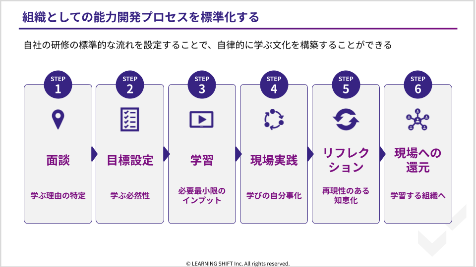 ポイントは、学習をプロセスの「真ん中」に置かないことです。学習はあくまで通過点であり、主役は「実践」と「リフレクション」です。ここが設計されていない限り、どれだけ優れた教材を揃えても、学びが個人の血肉として積み上がることはありません。