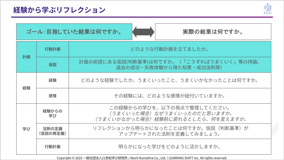 この段階の試験問題は、学習者自身の経験を構造化するための標準的なフォーマットを完成させることそのものです。経験学習を促すフレームワークは様々ですが、重要なのは、単なる「終わった後の感想」ではなく、「事前に立てた目標に対し、実践がどうであったか」を逆算して捉える構造を持つことです。