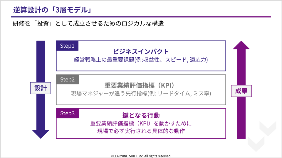 これら三つの層を垂直に統合し、「◯◯という行動が増えることで、△△という指標が改善され、最終的に▢▢というビジネスインパクトに繋がる」という論理構造を構築すること。これこそが、研修デザインにおける逆算設計の本質です。