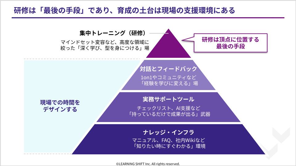 研修は、このピラミッドの頂点に位置する「最後の手段」であるべきです。現場のリーダーが真に求めているのは、社員を職場から引き離す研修ではなく、職場で成果を出しやすくするための「武器」の提供なのです。