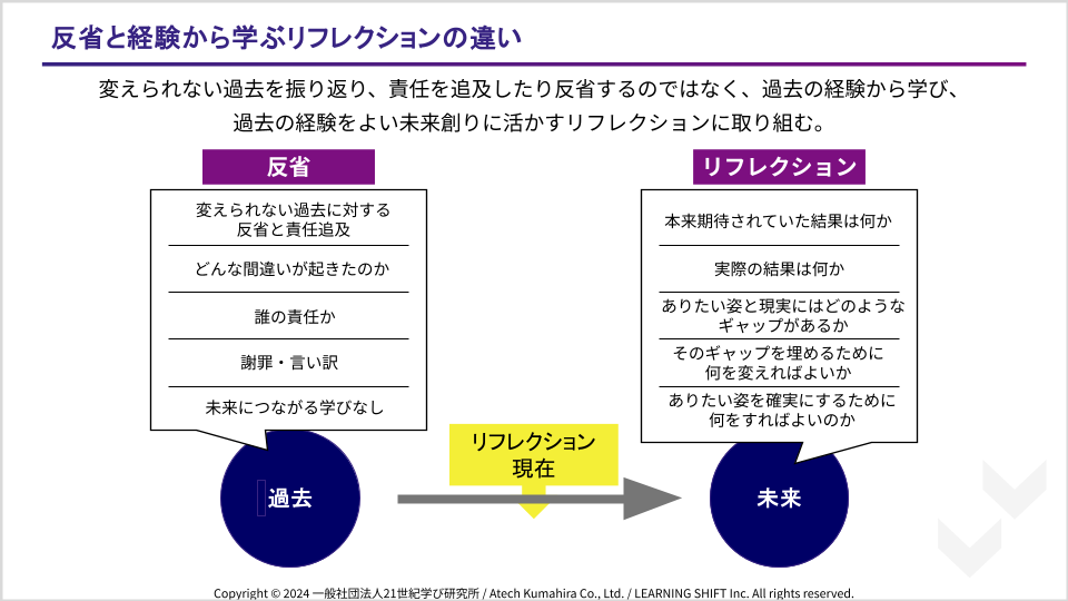 反省会は「過去」への謝罪ですが、リフレクションは「未来」への投資です。起きてしまったことは変えられません。でも、その経験をどう解釈し、次の1秒をどう創り変えるかは自分次第。リフレクションは、未来を創造する知的な活動なのです。