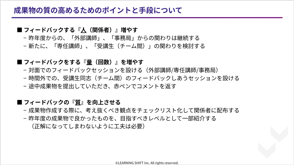 成果物の質を高めるためには、フィードバックの「人」「量」「質」も重要です。