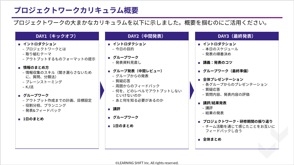 基本的には「キックオフ(DAY1)」→「中間発表(DAY2)」→「最終発表(DAY3)」という流れが王道です。