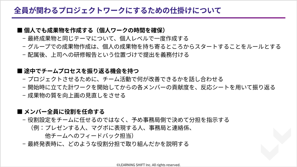 質: 「考え抜くべき観点」をチェックリスト化して配布したり、過去の良質な成果物を「目指すべきレベル」として紹介したりします(正解にならないよう注意)。
