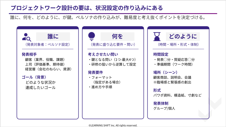 ここまで具体的に設定することで、受講者は「役員を説得するにはエビデンスが必要だ」「10分で伝えるには結論から話さないといけない」と、自ら考え始めます。これが「学習者体験(LX)のデザイン」です。