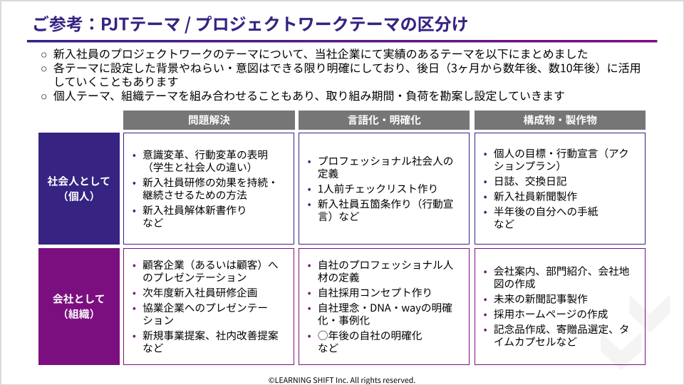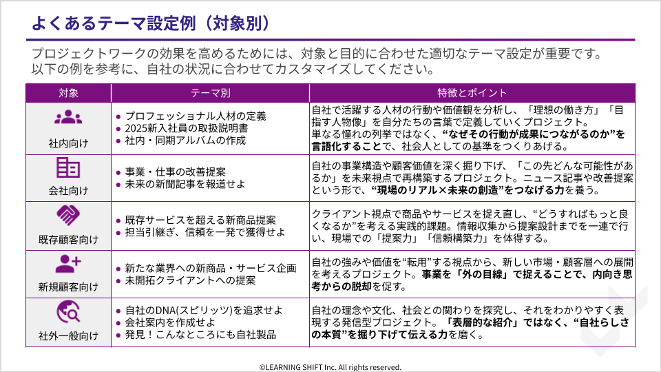 学習効果を最大化するためのテーマ設定の視点、具体的なテーマ事例、評価の仕組み、そして運営の仕掛けまで、設計のすべてを公開します。