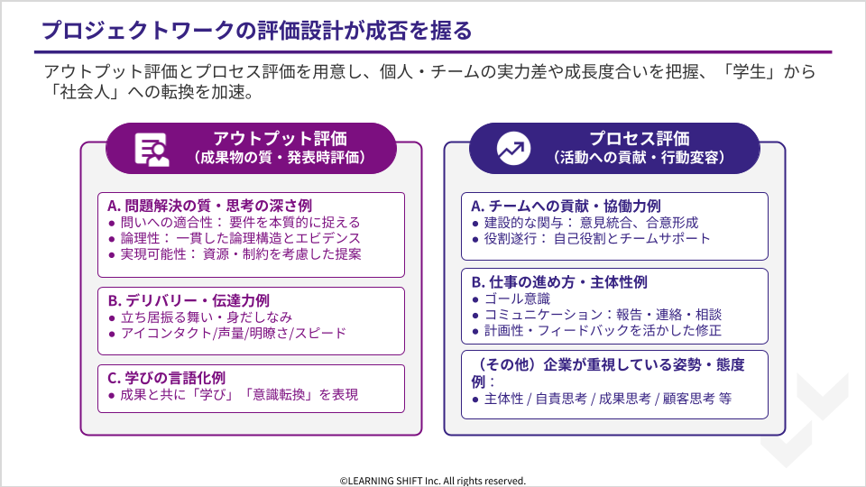 プロジェクトワークを「楽しい思い出」や「やりっぱなし」で終わらせないためには、明確な評価設計が不可欠です。評価は大きく2つの軸で考えます。個人・チームの実力差や成長度合いを把握し、「学生」から「社会人」への転換を加速させます。