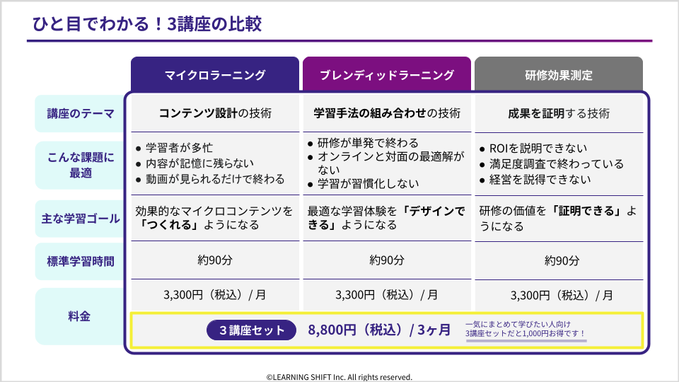 それぞれの講座は独立していますが、3つを学ぶことで、あなたの研修企画・設計能力は飛躍的に高まります。