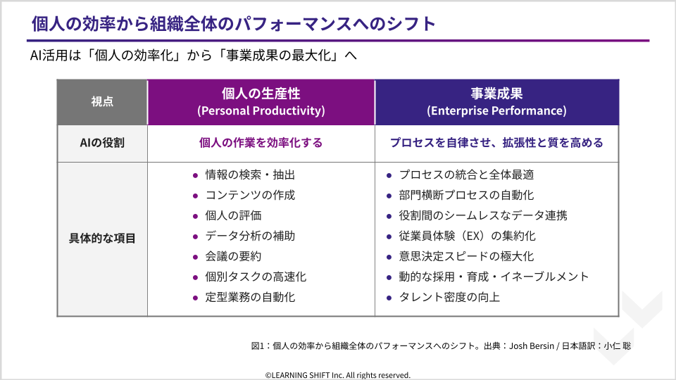 Bersin氏は、AIの目的を「個人の生産性(Personal Productivity)」を上げることだけに留めるのは、AIの真の価値を見誤っていると言及しています。